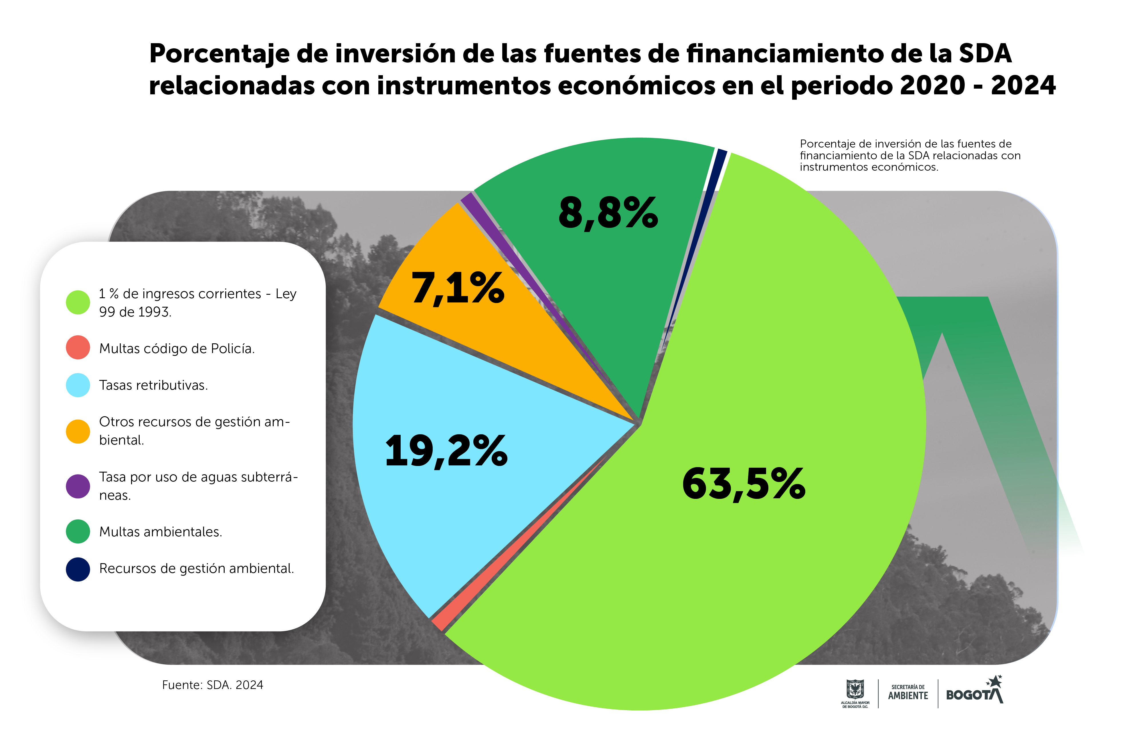 Dentro de estas fuentes, se destaca que la inversión del 1 % de los ingresos corrientes es la que aporta la mayor cantidad de recursos. Su aporte representa el 63,5% del total ejecutado en el cuatrienio 2020-2024, seguida por las tasas retributivas, que aportan el 19,24 %.