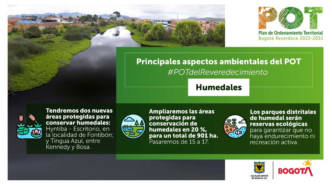 Además, se amplía el área en toda Bogotá en un 20 %, al pasar de 719 a 901 hectáreas de áreas protegidas para conservar humedales.